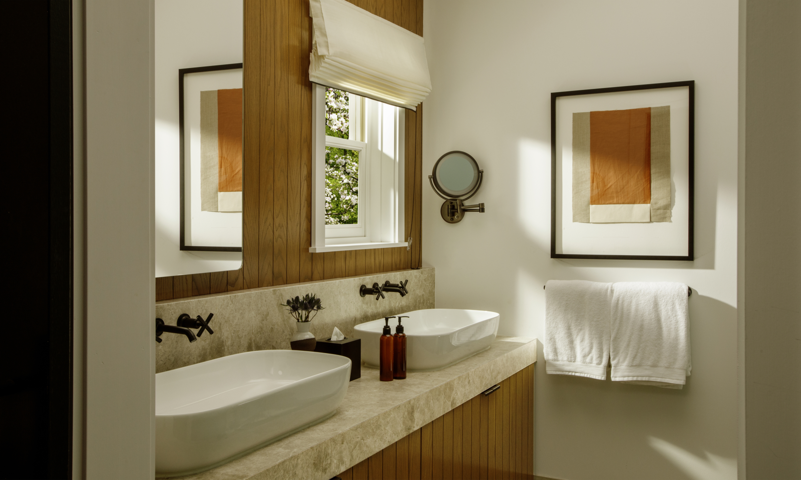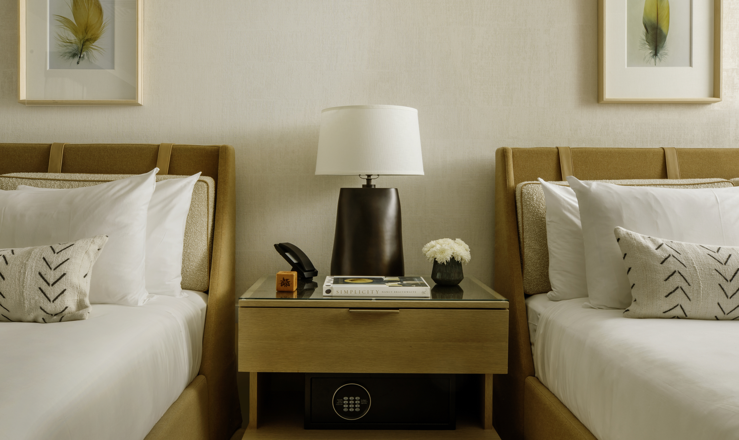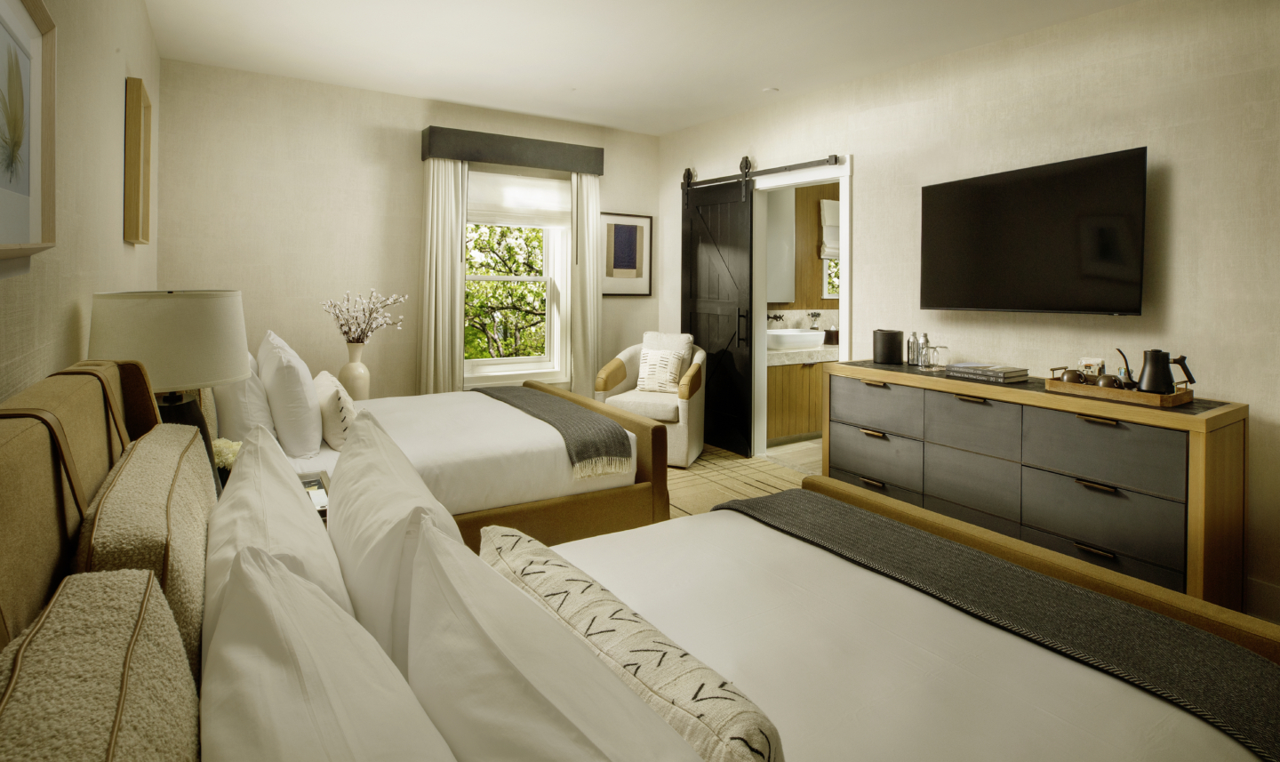Deluxe guestroom within a farmhouse-style residence. Features two queen sized beds and MacArthur luxury amenities.